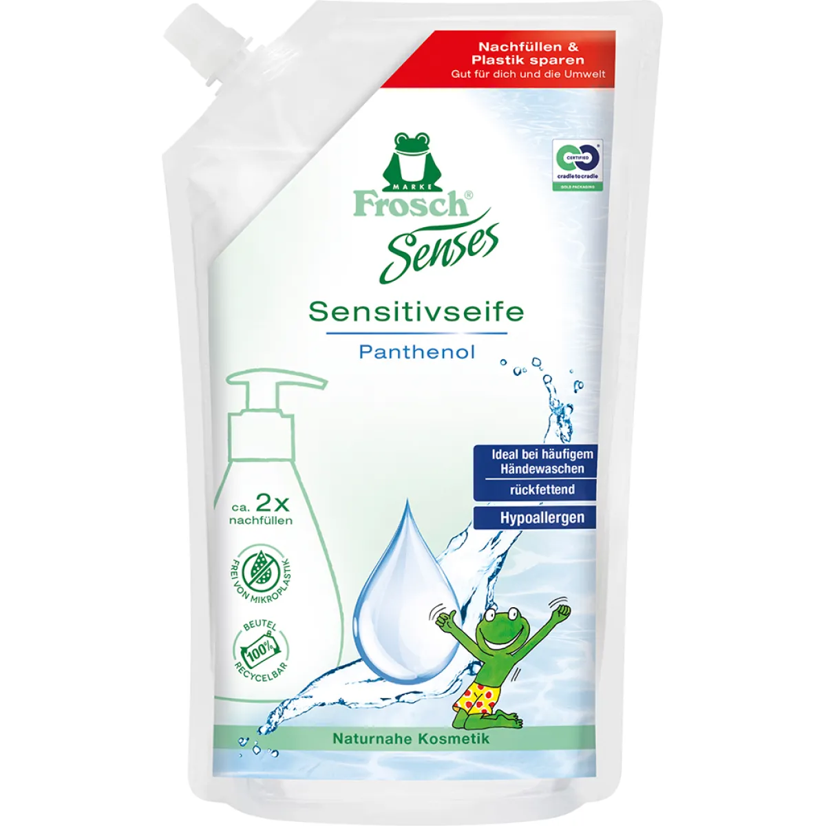 Die Sensitiv-Seife von Frosch ist vegan und frei von Mikroplastik, Parabenen sowie EDTA. Dank ihrer rückfettenden Inhaltsstoffe eignet sie sich ideal für häufiges Händewaschen. Die pH-hautneutrale Rezeptur reinigt sanft, schützt die Haut und unterstützt den natürlichen Säureschutzmantel. Damit ist sie besonders gut geeignet für sensible Haut sowie empfindliche Kinderhaut. Der 500-ml-Nachfüllbeutel reicht für etwa zwei Füllungen.