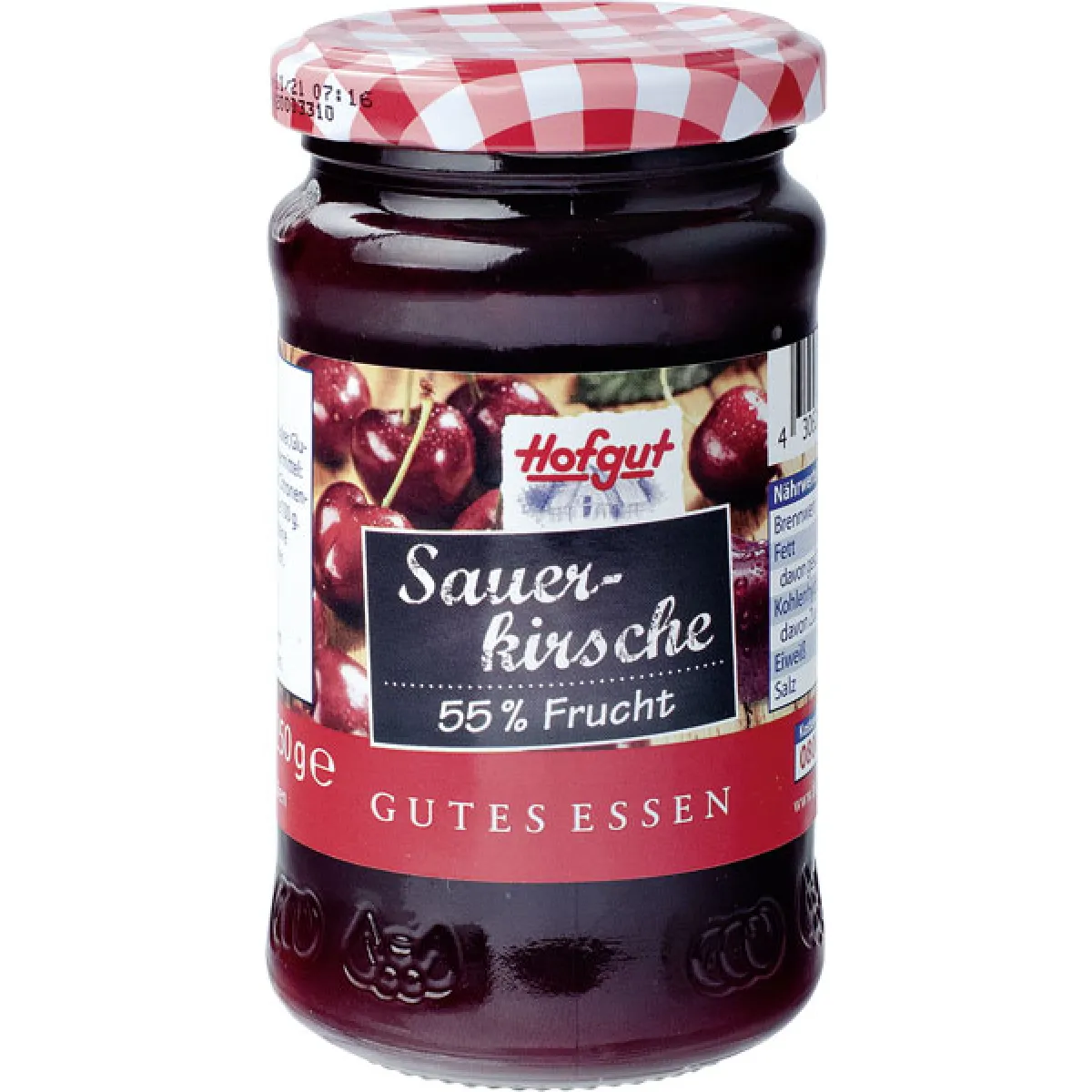 Der Fruchtaufstrich mit Sauerkirschgeschmack von Hofgut ist ein fruchtig-süßer Genuss für das Brot und besteht zu 55% aus Frucht. Da freuen sich vor allem diejenigen, die sich den Tag schon am Morgen gerne versüßen möchten.