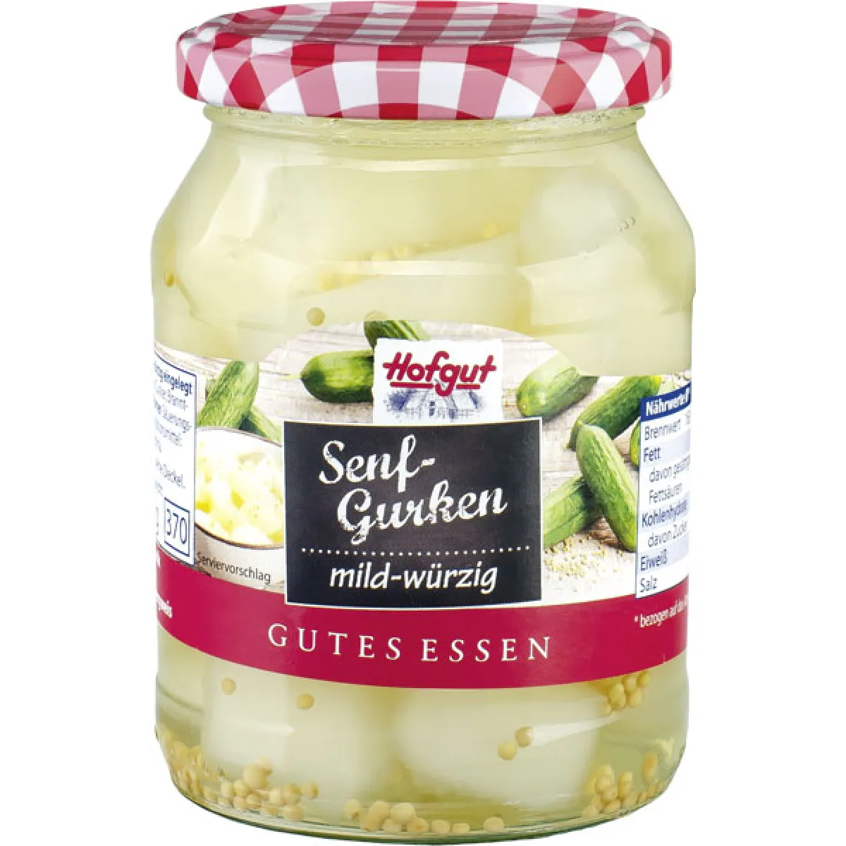 Die Senfgurken im Glas von Hofgut sind mild-würzig eingelegt und gut als Snack geeignet. Aber auch auf Brot, in Salaten und Saucen sind die Gurken gern gesehen und verleihen einen frischen süß-säuerlichen Geschmack.