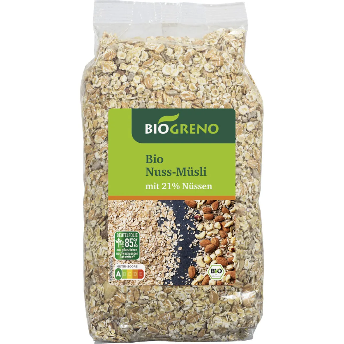 Oder wie wäre es mit einer Portion Müsli-Crunch für zwischendurch? Mische das Biogreno Nuss-Müsli mit Ahornsirup und Kokosöl, backe es im Ofen goldbraun und verwende es als veganes Granola über Desserts oder Bowls.
