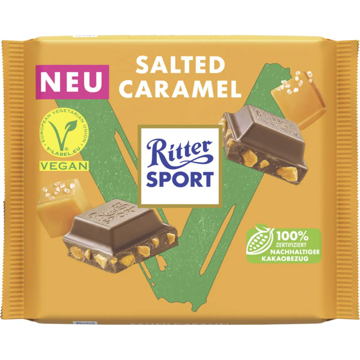 Ritter Sport Salted Caramel ist übersäht mit knusprigen Karamellstückchen die auf eine leichte Salznote treffen. Zusammen mit der feinen cremigen veganen Schokolade braucht man sich die Frage ob süß oder salzig nicht mehr stellen - Beides geht.