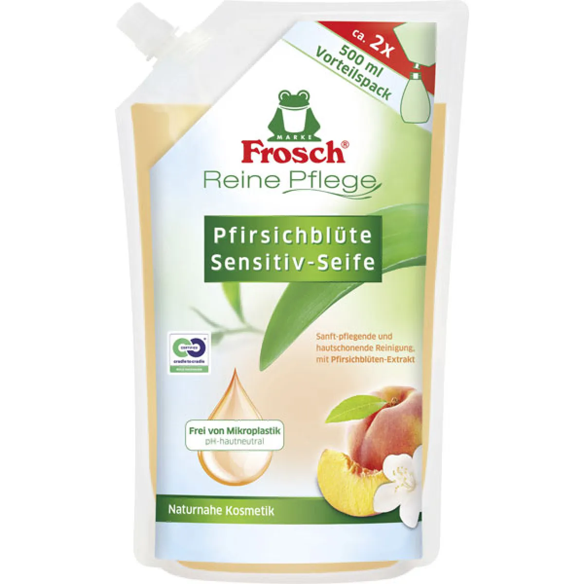 Die Pfirsichblüten Cremeseife von Frosch ist vegan, frei von Mikroplastik, Parabenen und EDTA und pflegt sanft und schützt die Haut vor der Austrocknung. Die pH-neutrale Rezeptur unterstützt den natürlichen Säureschutzmantel und riecht angenehm nach Pfirsich. Der 500 ml Nachfüllbeutel reicht für ca. 2 Füllungen.